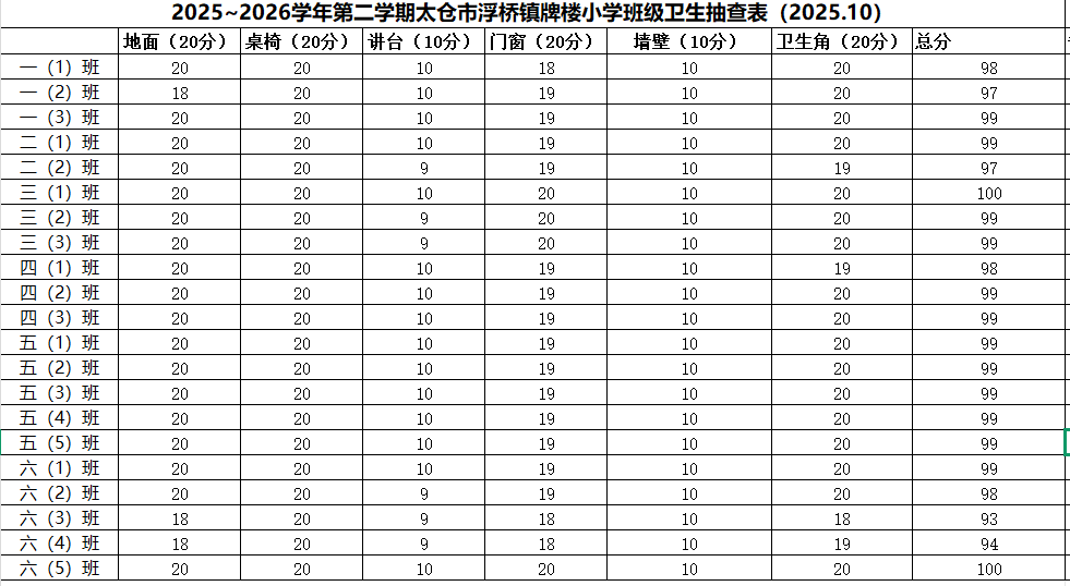 2025~2026学年第一学期学生班级卫生抽查表(2025.10)