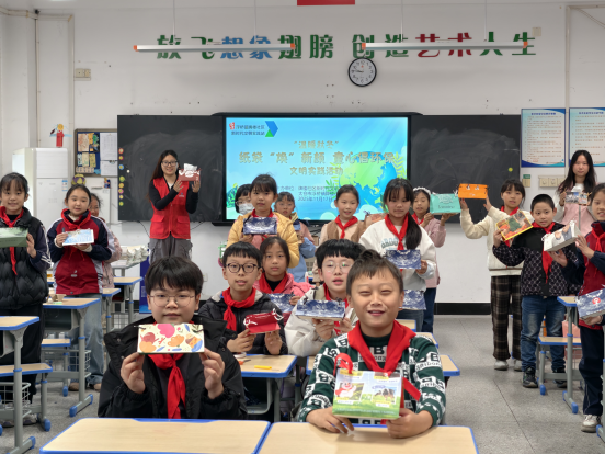 活动现场,牌楼社区王主任以“全球气候变化与儿童责任”为切入点,为学生们带来一堂生动的环保课。他从垃圾对地球生态的危害讲起,详细普及垃圾分类知识,引导学生认识到环保行动与自身成长、地球未来的紧密联系。随后,社区志愿者与学生们开启“纸袋改纸巾盒”的创意实践:志愿者们示范裁剪、折叠、装饰的技巧,学生们则发挥奇思妙想,将普通纸袋“变身”为实用美观的纸巾盒,在动手创作中践行环保理念。