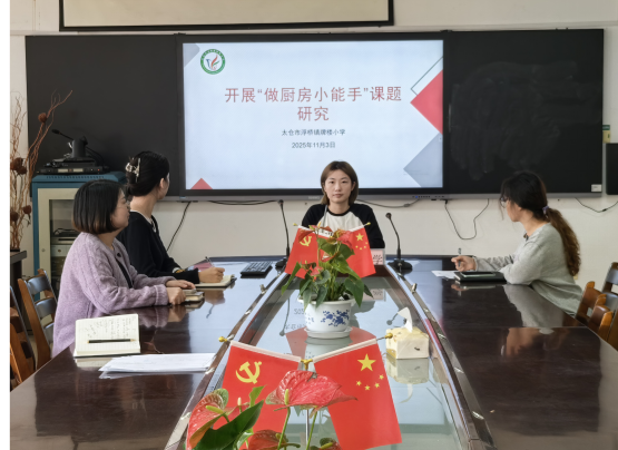 2025年11月3日,牌楼小学“基于‘学·行’文化开展劳动教育的实践研究”课题组教师齐聚大会议室,围绕“做厨房小能手”主题研究展开深度研讨与部署。